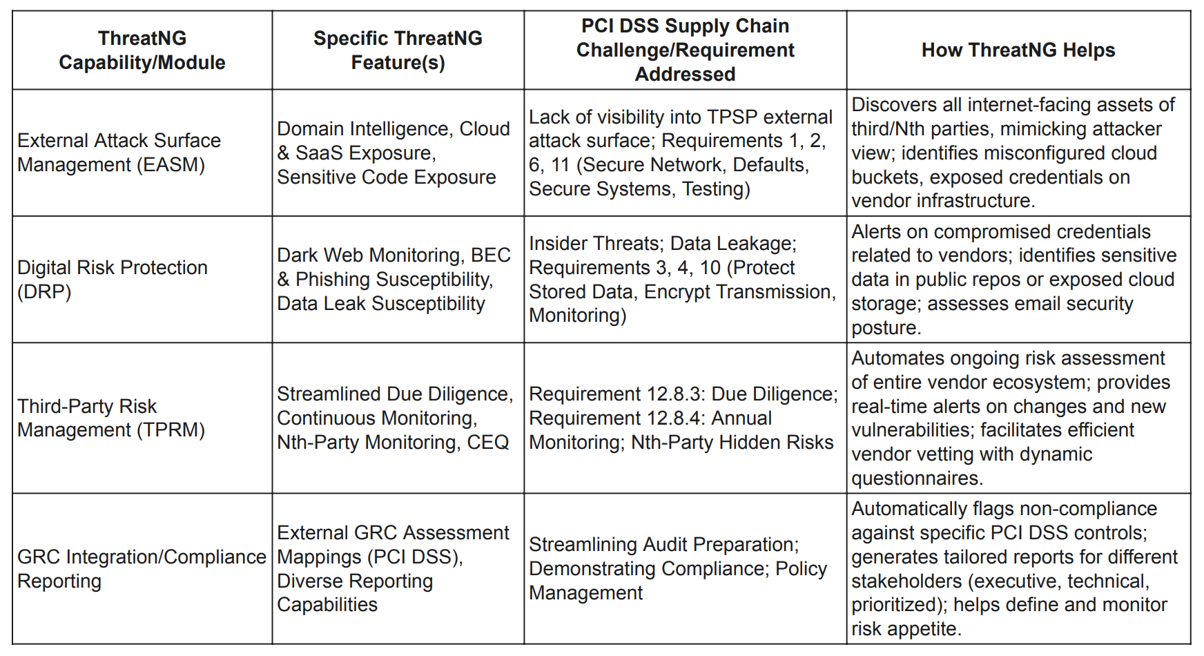 Table: ThreatNG Capabilities Mapping to PCI DSS Supply Chain Compliance