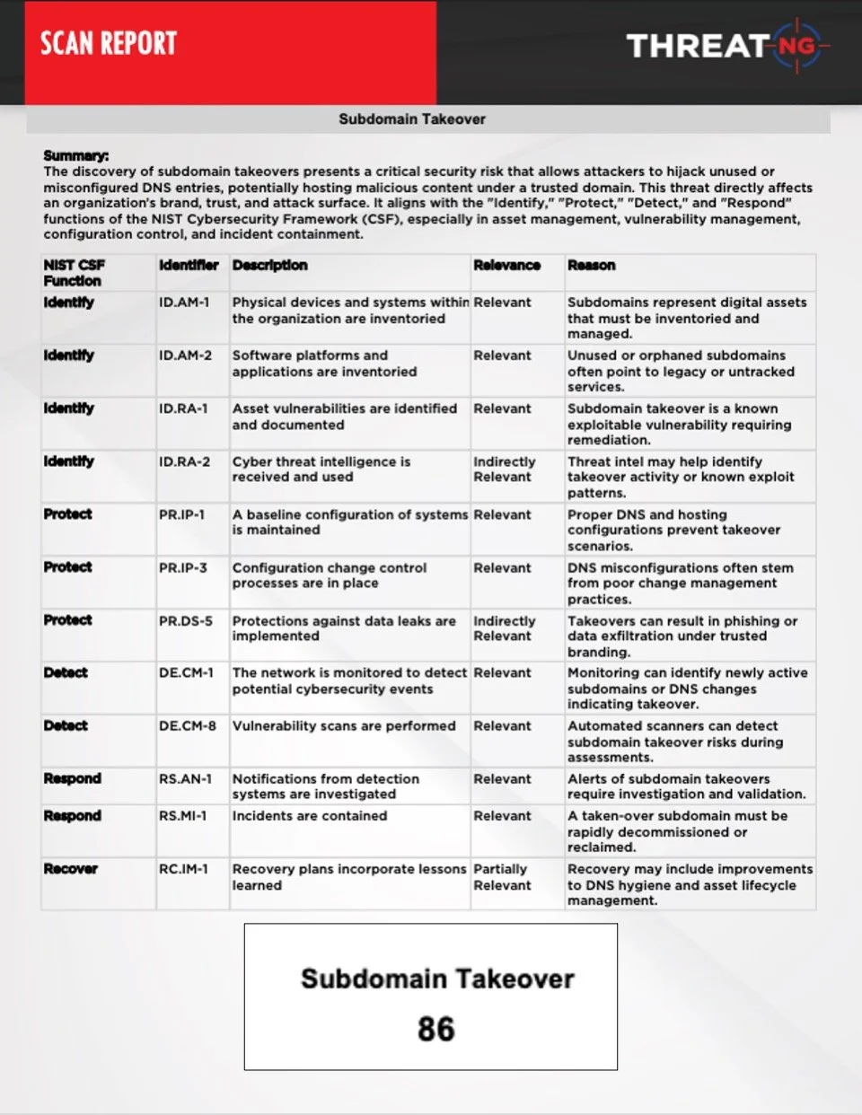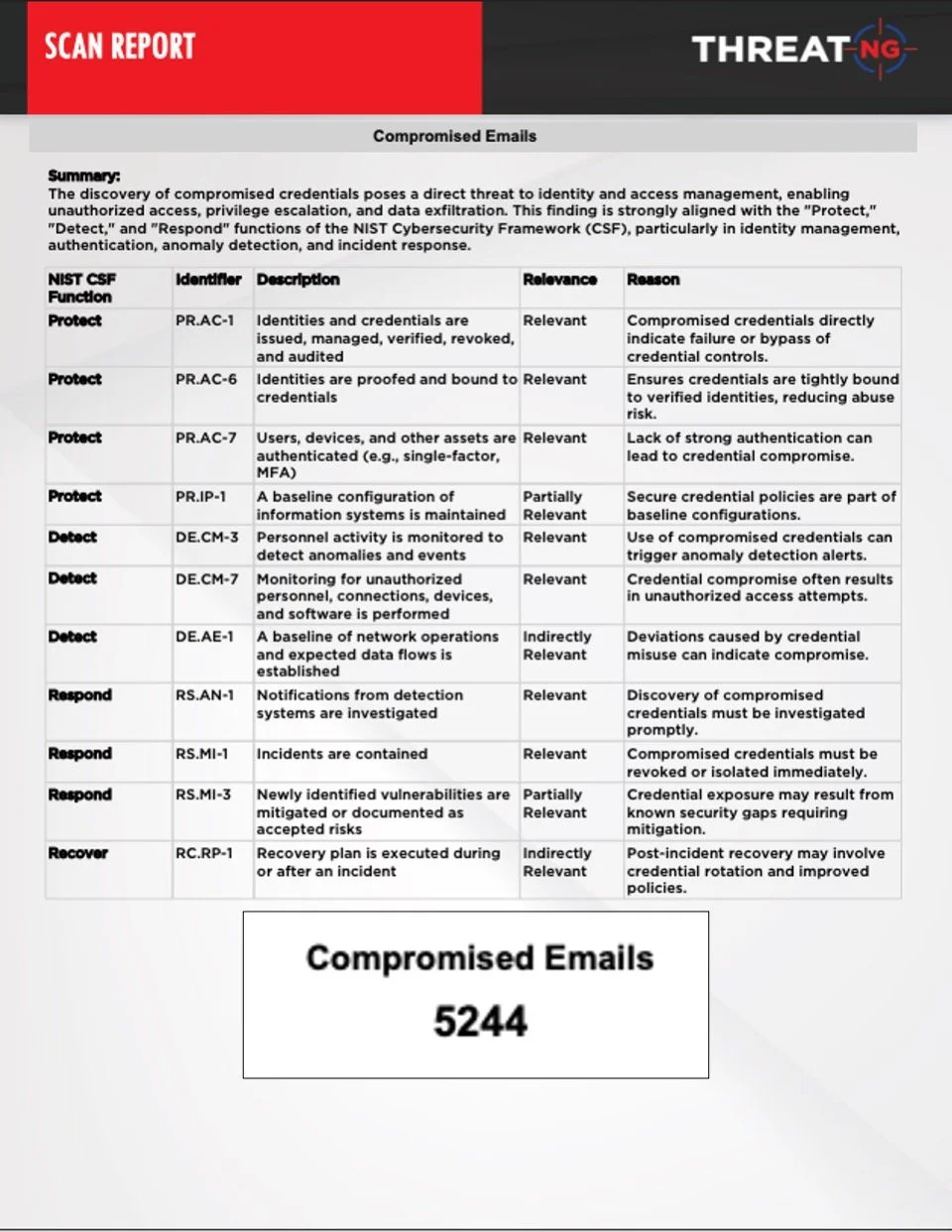 Mapping: Every discovered risk—from Compromised Emails to Subdomain Takeover susceptibility —is automatically mapped to the relevant NIST CSF subcategory (e.g., PR.AC-1, ID.AM-2, PR.DS-5).