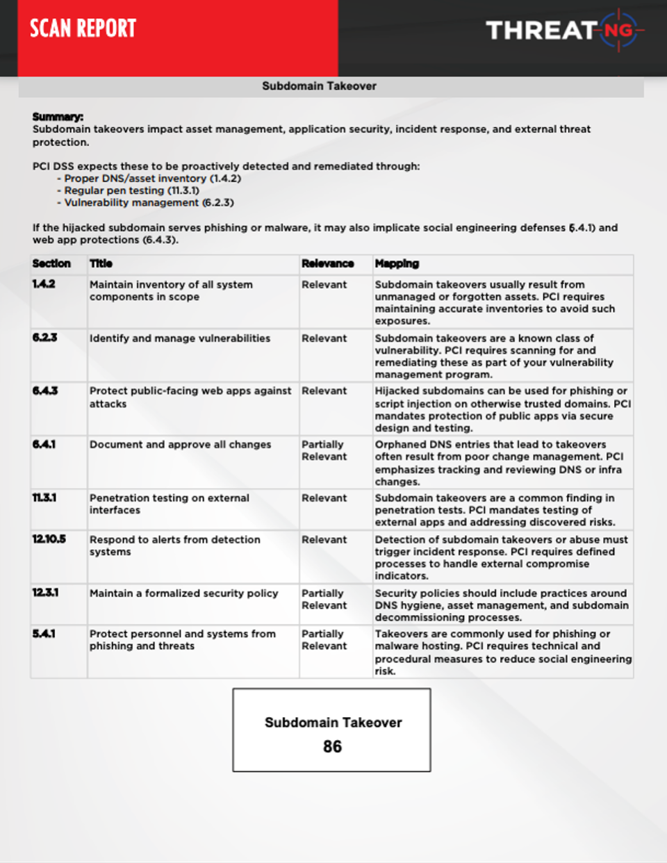 Penalty Avoidance: Non-compliance with PCI DSS can result in severe fines, loss of card processing privileges, and reputational damage. ThreatNG helps proactively mitigate these risks.
