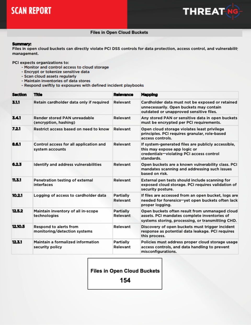 ThreatNG streamlines your external PCI assessment by providing clear, actionable insights into your security posture from an attacker's perspective. Our easy-to-read reports detail crucial findings, including sensitive information exposed in public repositories, compromised credentials, default port scans, and mentions on the dark web. Each finding is meticulously mapped to relevant PCI DSS requirements, enabling organizations to understand their compliance status and prioritize remediation efforts to enhance their security defenses and protect cardholder data.